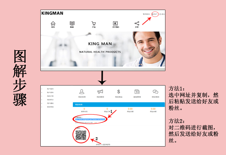 A根据以上步骤将自己的分销地址发送出去,B通过A的链接关注“金迈成”微信公众平台,并进入金迈商城网站购买了产品,B就成为了您的二级消费者,B产生的所有消费额的10%将会返利到你的账户。