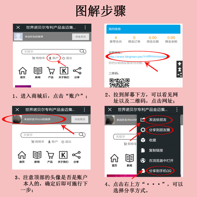 进入商城后(已经处于登录状态):点击“账户”,然后下拉屏幕→点击分销地址→确认账户→点击“···”→“分享到朋友圈”或“发送给朋友”或“分享到手机QQ”。这样您的分销链接就分享成功了。