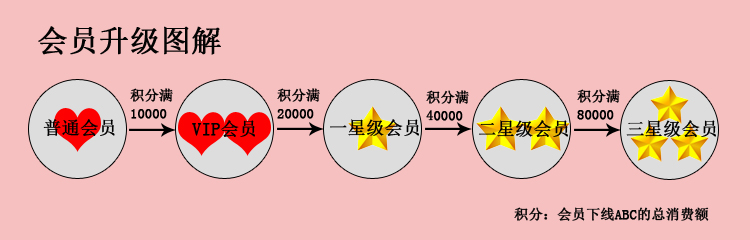当VIP会员的分享系统内ABC层会员的总消费额累计达到2万元,将自动升为一星级会员;